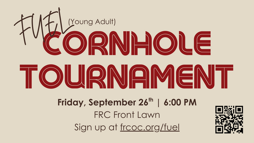 Hey everyone! Join us for a Cornhole Tournament on Friday, September 26th on the FRC Front Lawn! Bring a lawn chair and a snack to share!