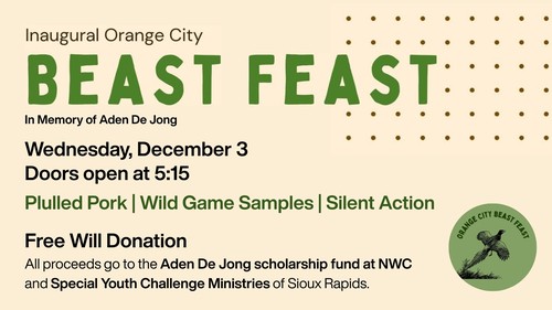 Plan to join us on Wednesday, December 3, at 5:15 p.m. for a fun evening at First Reformed Church. Enjoy a pulled pork meal, try wild game samples, and take part in a silent auction. All donations support the Aden De Jong Scholarship Fund and Special Youth Challenge Ministries.