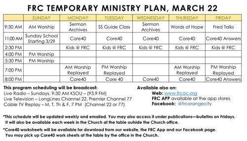 - A condensed version of this Sunday’s bulletin is available in print form at the table by the Church office and online at frcoc.org under publications. You may also access it through the FRC App.