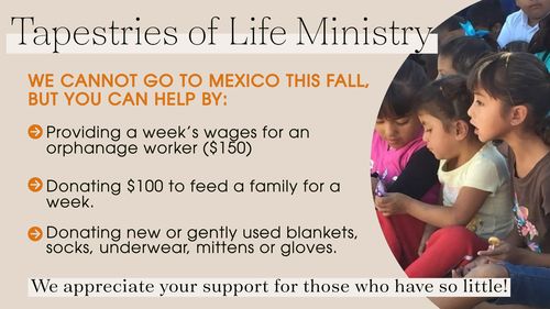 TAPESTRIES OF LIFE MINISTRY- Due to COVID-19 we will not be going to Mexico this fall but we need to provide support for this ministry. The people in the Guadalupe area have been hit very hard by the pandemic. Many are dealing with Covid issues and many are out of work. We would like to help in the following ways: