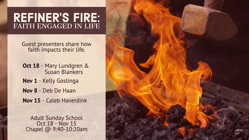 Refiner's Fire: Faith Engaged In Life is a special adult Sunday School class where different community members are invited to share how their faith impacts their life specifically in relations to their job. This class meets in the Chapel between services (approx. 9:40-10:20am). The lineup of guest presenters we have are as follows: