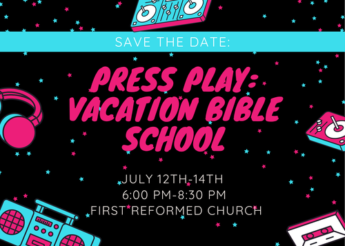 Mark your calendars for VBS this summer on July 12th - 14th from 6:00 pm - 8:30 pm at First Reformed Church! It will be a an amazing time for kids that completed K-5th grade to learn about Jesus.