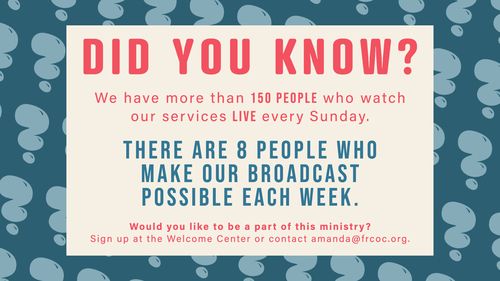 Every week our broadcast ministry impacts more and more people. Currently we have over 150 people who watch our services LIVE every Sunday and many more who watch throughout the week. We have 8 people who make this broadcast possible each week - two sound technicians, two camera operators, two powerpoint operators, a broadcast person, and a Facebook host.