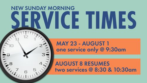 Starting this Sunday morning (May 23) we are entering our summer service schedule. We will have one service on Sunday mornings at 9:30am. On August 8 our schedule of two services will resume (8:30 & 10:30am).