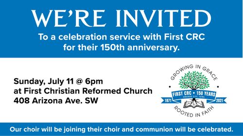 We're invited to a 150th anniversary celebration service with First Christian Reformed Church on Sunday, July 11 at 6pm. The service will