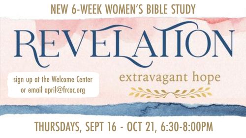 The new 6-Week Bible Study - Revelation: Extravagant Hope will meet on Thursdays, Sept 16 - Oct 21 from 6:30-8:00pm. In this study, Bible teacher and author Margaret Feinberg digs into Revelation, reminding us of God's power and promises during times of suffering and persecution. Study will be lead by April Beaver. Sign up at the Welcome Center or contact [email protected]. Workbooks are $10. For more information about the study or to watch a promo CLICK HERE.