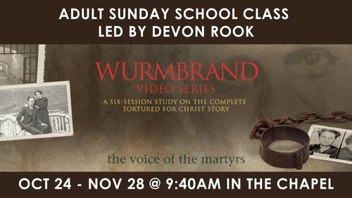 A new Adult Sunday School class begins October 24 in the Chapel lead by Devon Rook. In this 6-week class, participants will watch a short video about Richard and Sabina Wurmbrand who were tortured for their belief in Christ. After the video there will be a short discussion time. Through this study you will be inspired to love and forgive your enemies and begin to see opportunities to participate in the advancement of God's kingdom.