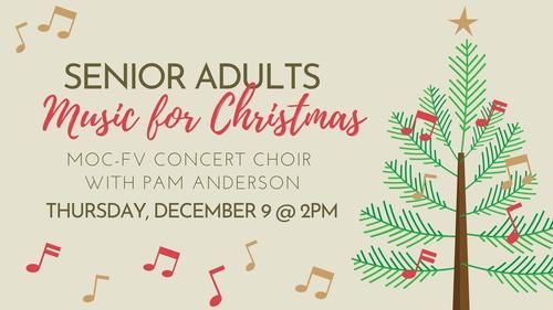 On Thursday, December 9 at 2pm our Senior Adults(65+) will be able to listen to choir students from MOC-FV sing "Music for Christmas". Come fellowship with other Seniors and listen to the students sing beautiful Christmas music.