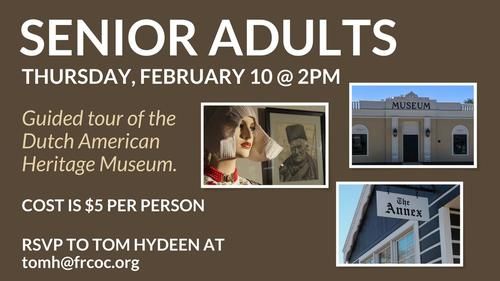 On Thursday, February 10 at 2pm, our Senior Adults (65+) will be treated with a guided tour of the Dutch American Heritage Museum. The cost is $5 per person. RSVP to Tom Hydeen at [email protected] for this fantastic opportunity.