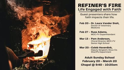 Refiner's Fire: Life Engaged with Faith is an Adult Sunday school class offered February 20 - March 20 at 9:40am in the Chapel. With this class we will have a great opportunity to hear from some professionals in our community as they talk about how faith impacts their life.