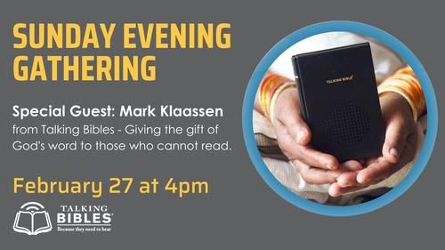 On Sunday evening, February 27, at 4pm we will have a special guest speaker from Talking Bibles, Mark Klaassen. Talking Bibles gives the gift of God's word to those who cannot read by producing audio recordings of translated Scriptures in hundreds of languages and making these recordings accessible in the form of Talking Bibles for millions of people around the world who cannot read. Read more about Talking Bibles at https://www.talkingbibles.org/.
