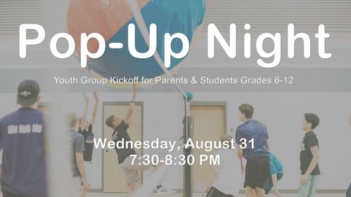 Our Youth Ministry event is Pop-Up Night on August 31st from 7:30-8:30 PM in the gym. This event is for middle and high school parents, students, and volunteers. We'll have push-pops, face off in a giant volleyball game, and talk about our goals for the year.