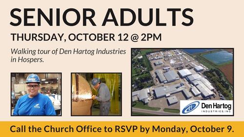 Join us Thursday, October 12 at 2:00 PM for a walking tour of Den Hartog Industries in Hospers. Call the church office at 737-4909 by noon on Monday, October 9, to reserve your space on the church van.