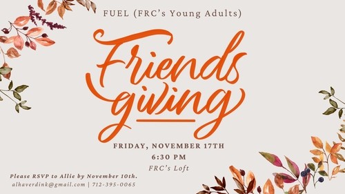 Join our Young Adults on Friday, November 17th at 6:30 pm in the Loft for a fun Friendsgiving event. RSVP to Allie Haverdink by November 10.