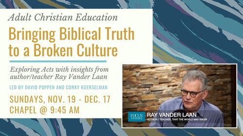 Bringing Biblical Truth to a Broken Culture meets in the Chapel. Dave Poppen and Corky Koerselman will be team teaching this series on engaging culture. This study will include short videos by author/teacher Ray Vander Laan.