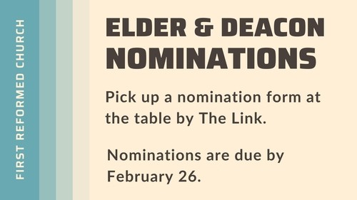 Nomination ballots for our Elders and Deacons will be available beginning February 11 through Sunday, February 18. Ballots can be picked up at the table by Link after each service or at the Church office during the week. Absentee Ballots can be requested at the Church Office (737-4909) through February 14. All Ballots must be returned by February 26.