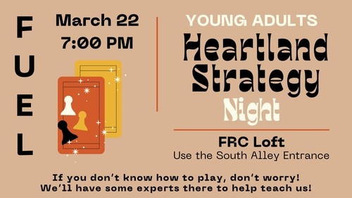 Join our Young Adults for a game night of Heartland Strategy Night on March 22 at 7 pm in the Loft. If you don't know how to play, don't worry! We'll have some experts there to help teach us!