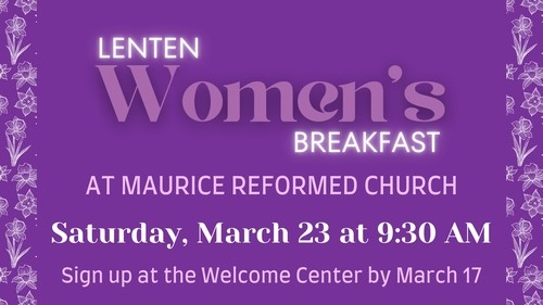 Maurice Reformed Church has invited our women and young women to attend their Women's Lenten Breakfast on Saturday, March 23, at 9:30 AM. The guest speaker is Val Dykstra, a gymnastics coach and advocate for young ladies in body image and self-esteem. Val's amazing testimony includes her work with young ladies and her cancer-related health battles.