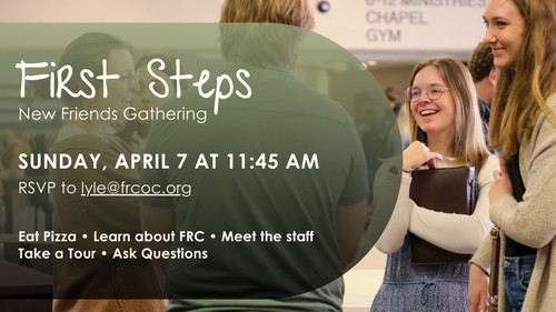 The Staff would like to invite you to join us for lunch and a time of exploration of FRC on April 7 at 11:45 am. We will have a tour of our building, a chance for you to meet our staff, and an opportunity to ask any questions. Pizza will be provided. Let us share why we'd love to have you join our community.