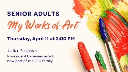 Join us on Thursday, April 11, at 2 pm for Senior Adults (65+). Julia Popova will share her art. Julia is a artist from Ukraine. She and her husband Vova came to the US in December 2022 with the help of our church.