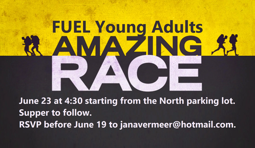 Our Young Adults group, FUEL, meets on June 23 for an "Amazing Race." Meet at 4:30 in the North FRC parking lot. Supper to follow. RSVP before June 19 to [email protected].