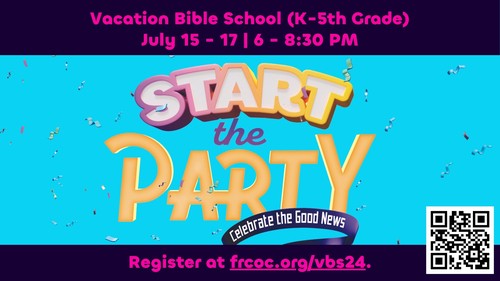 - You can register your Kindergarten-5th grader or volunteer at frcoc.org/vbs2024 or scan the QR code.