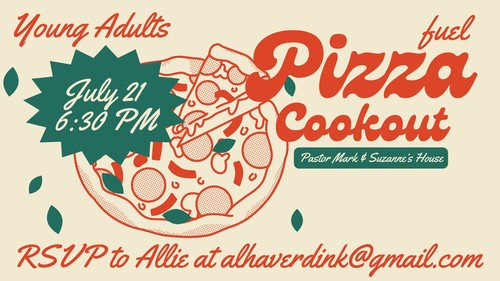 Our Young Adults group, FUEL, meets on July 21 at 6:30 pm at Pastor Mark & Suzanne's house for a Pizza Cookout. Come hang out and have some great pizza! RSVP to Allie Haverdink at [email protected].