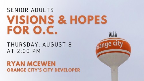 Join us on Thursday, August 8 at 2 pm to hear information from Orange City's City Developer, Ryan McEwen. Ryan will outline some of the "Visions & Hopes" planned for Orange City. This event will take place in the Fellowship Hall.