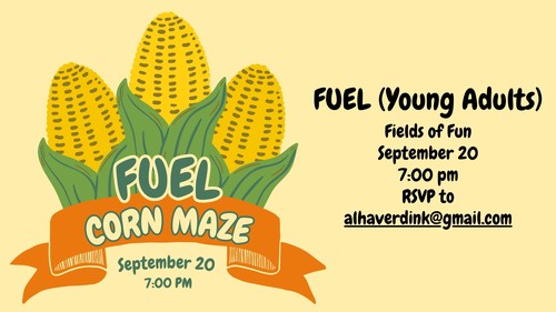 FUEL, our Young Adults group, is going to Fields of Fun on Friday, September 20 to run through the Corn Maze. Meet there at 7:00 pm and RSVP to Allie Haverdink so she knows to expect you.