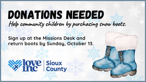 Love INC Donations: Many children in the surrounding area lost their winter apparel in the flood this summer. We can help by purchasing new snow boots! Sign up at the Mission desk for the size you are purchasing, and bring them back by October 13. Thank you for supporting Love INC and our community!