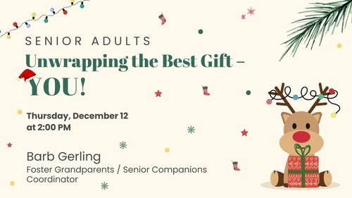 Senior Adults (65 +), join us on Thursday, December 12 at 2:00 PM in the Fellowship Hall for "Unwrapping the Best Gift - YOU!" Our guest speaker, Barb Gerling, will help us learn how to become Foster Grandparents and Senior Companions.