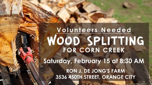 Join us out at Ron J. De Jong's farm (3536 450th Street, Orange City) on Saturday, February 15 at 8:30 am to cut wood for Corn Creek.