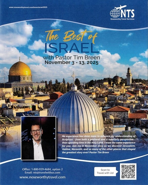 Pastor Tim is leading a group to Israel from November 3 - 13, 2024. The capacity of this trip is limited to 45 participants. You can reserve your spot at www.noseworthytravel.com/breenisrael2025.