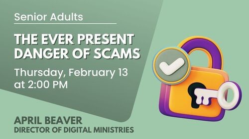 Senior Adults, join us on Thursday, February 13 at 2:00 pm in the Fellowship Hall for "The Ever Present Danger of Scams" with April Beaver, FRC's Director of Digital Ministries.