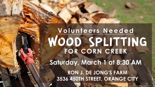 Join us out at Ron J. De Jong's farm (3536 450th Street, Orange City) on Saturday, March 1 at 8:30 am to cut wood for Corn Creek.