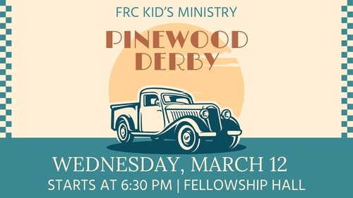 You're invited to the Pinewood Derby hosted by Kids' Ministry on March 12 at 6:30 PM in the Fellowship Hall! Come cheer on the kids as they race the cars they’ve built, competing for Best in Show and Fastest Car. It will be an evening full of fun, fellowship, and friendly competition. Bring the whole family and join us for this exciting event!