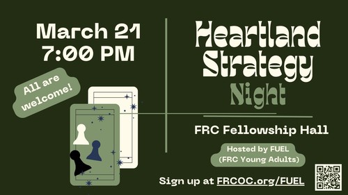FRC's Young Adult Group, FUEL, is hosting a Heartland Strategy Night on Friday, March 21st! This event is open to anyone- not just the young adults. If you don't know how to play Heartland Strategy, no worries! We will have our very own Heartland experts there to help teach new players!