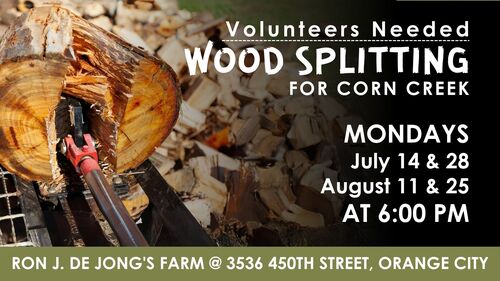 Join us for wood splitting on the 2nd & 4th Mondays of July and August: