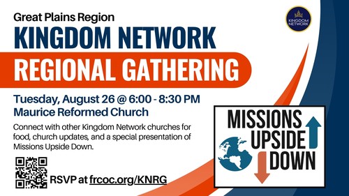 Join us for a Kingdom Network Regional Gathering on Tuesday, August 26 from 6:00–8:30 PM at Maurice Reformed Church. This evening is a chance to connect with others from our Kingdom Network churches for a meaningful time of food, fellowship, and shared vision.
