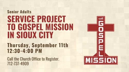 On Thursday, September 11, our Senior Adults (ages 65+) are invited to take part in a meaningful service opportunity at Gospel Mission in Sioux City. This is a great way to serve together, bless others, and make a difference in our community.