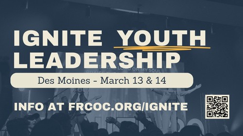We’re taking a group of students to the Ignite Youth Leadership Conference in Des Moines, Mar 13–14. This free trip includes separate middle school and high school teams (grades 7-12), each guided by an adult leader mentor. It’s free, but limited to 12 spots. Selection is based on application answers + leadership engagement. Students can list a friend, but both must apply.
