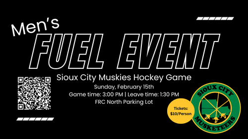 Men! Sign up for a fun afternoon at the Tyson Event Center in Sioux City for a Sioux City Musketeers Hockey game! We will meet in the FRC north parking lot at 1:30 and carpool to Sioux City together. Please sign up by February 8th, so we can order tickets. Please also bring $10 cash for your ticket.