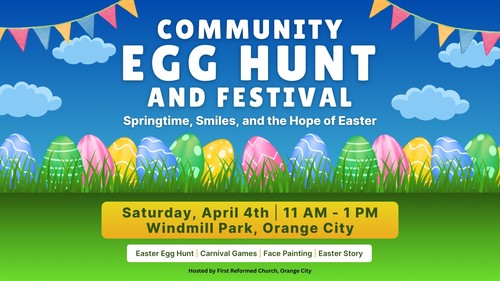 We’re excited to share that this year our church is taking over the Community Easter Egg Hunt from the Orange City Chamber! Join us on April 4 from 11:00 a.m. to 1:00 p.m. at Windmill Park for a fun morning for the whole family.