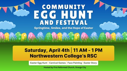 We’re excited to share that this year our church is taking over the Community Easter Egg Hunt from the Orange City Chamber! Join us on April 4 from 11:00 a.m. to 1:00 p.m. for a fun morning for the whole family.